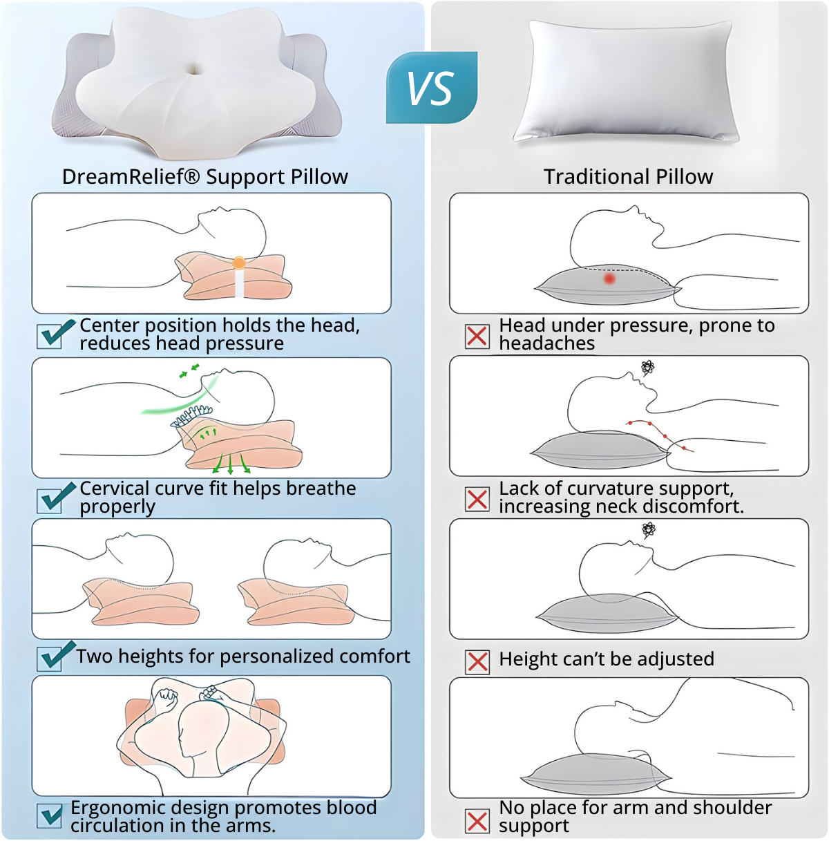 The DreamRelief® Support Pillow is designed to alleviate neck and shoulder pain by ensuring proper alignment of your neck, shoulders, and spine. This ergonomic support helps distribute weight evenly, reduce pressure points, and prevent future pain, allowing you to wake up rested and pain-free.