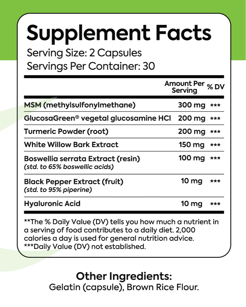 Ingredients: MSM (methylsulfonylmethane), GlucosaGreen® vegetal glucosamine HCl, Turmeric Powder (root), White Willow Bark Extract, Boswellia serrata Extract (resin)(std. to 65% boswellic acids), Black Pepper Extract (fruit) (std. to 95% piperine), Hyaluronic Acid.